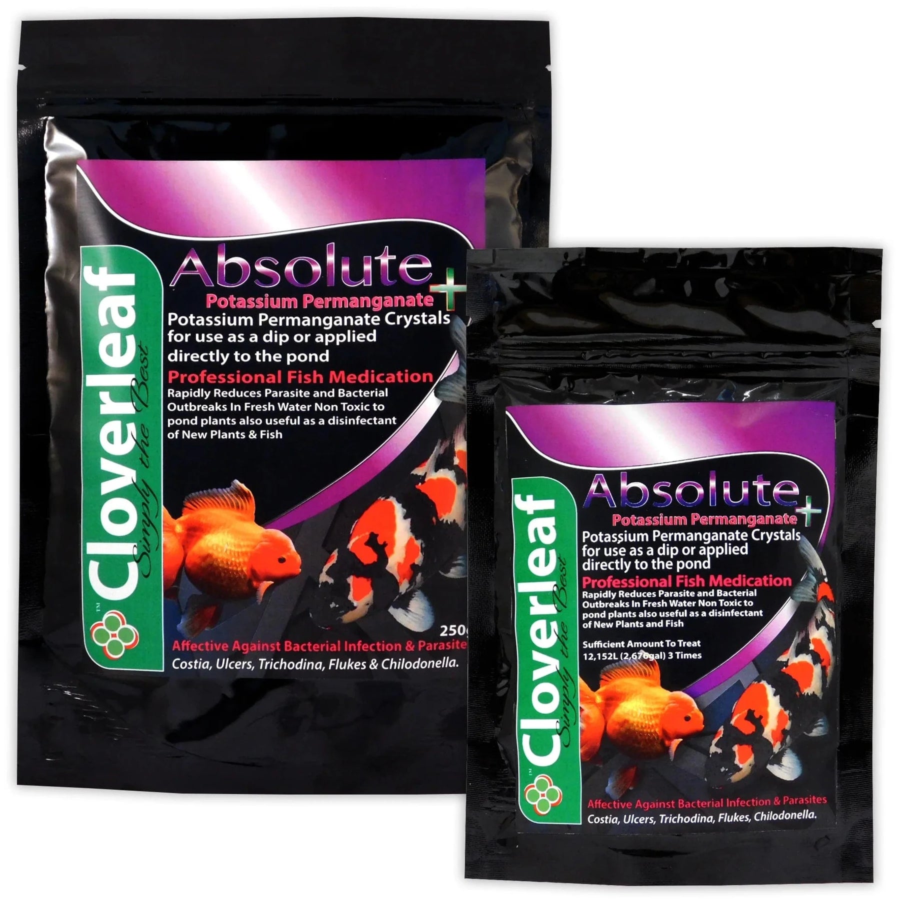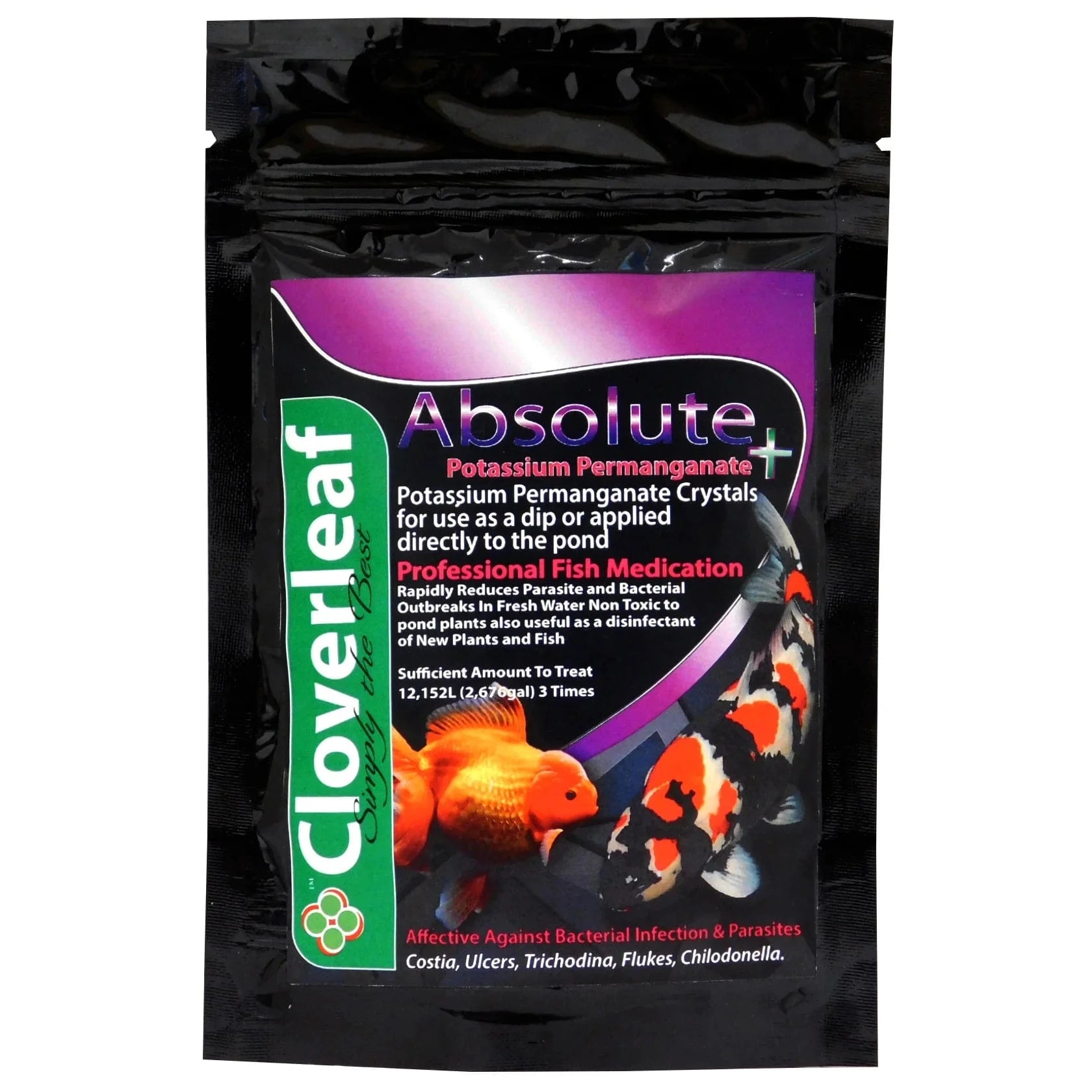 Cloverleaf Absolute Potassium Permanganate+ is a powerful and trusted treatment designed to target a broad range of external parasites and water-borne infections in koi and pond fish. Known for its strong oxidising power, this treatment not only eliminates parasites but also enhances water clarity by breaking down dissolved organic waste.
